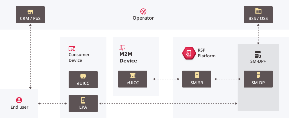A Remote SIM Provisioning platform is a complex software architecture that manages, in a safe and reliable way, the generation of eSIM Profiles from the Profile Template, the secure storage of each eSIM Profile, the management of the status of each eSIM Profile (allocated, available, released, installed, enabled, disabled, deleted), download to the target eUICC.